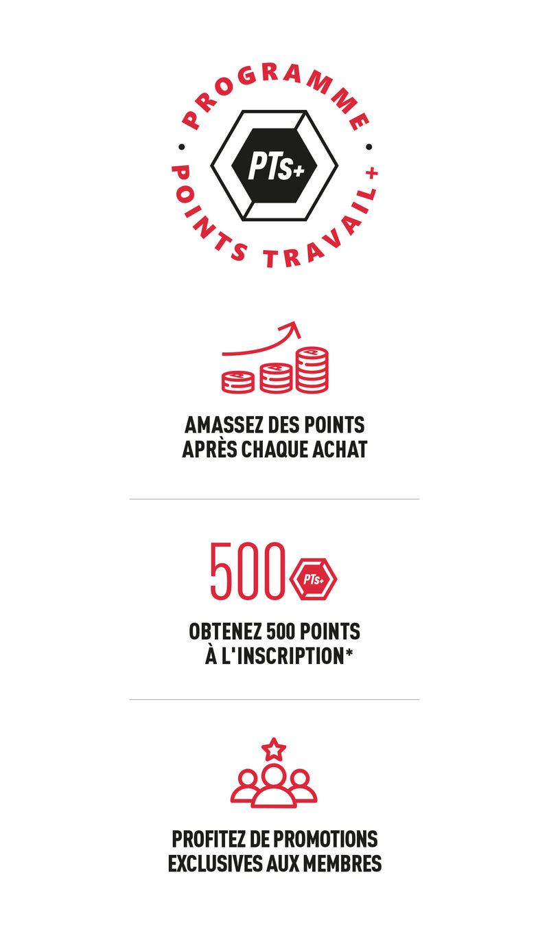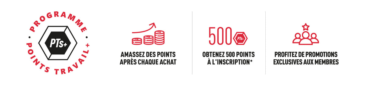 Le programme Points Travail + vous permet d'accumuler des points et de les transformer en rabais sur vos chaussures et vêtements de travail! Profitez également de promotions exclusives aux membres du programme.