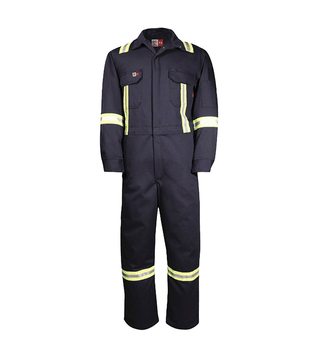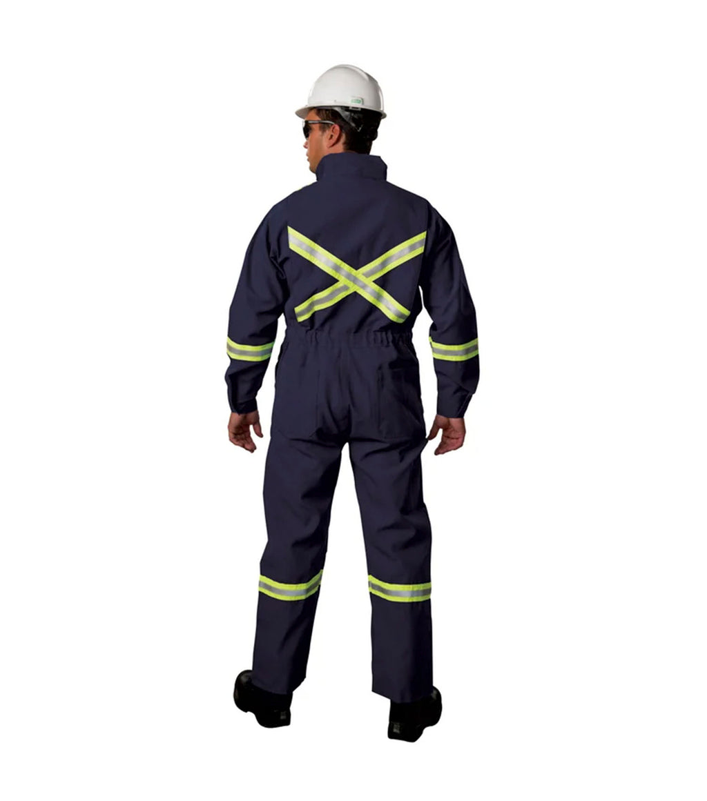 Emplacement du matériau réfléchissant résistant aux flammes: deux bandes verticales à l'avant avec un espace non couvert au niveau de la zone de broderie au-dessus des poches de poitrine (les rabats des poches ne sont pas recouverts), un «X» à l'arrière, une bande horizontale autour de chaque jambe et de chaque bras.