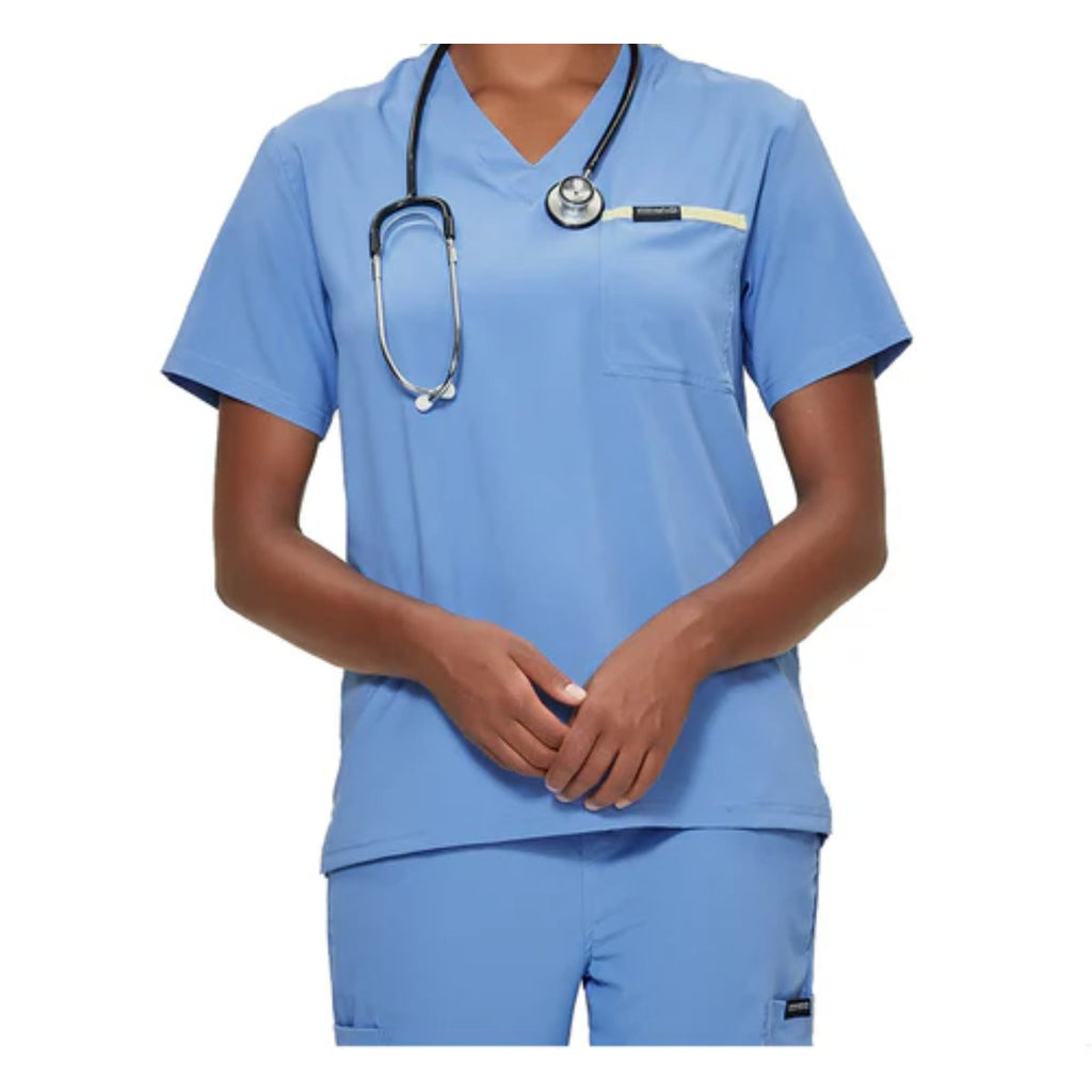 Cette chemise médicale unisexe est faite pour vous accompagner tous les jours dans votre travail. Elle a un look simple et épuré avec son col en V et sa poche poitrine. Les coutures ont été doublées pour une durabilité accrue. Pour le bonheur de tous, notre chemise en fibre de polyester ne froisse pas et est très facile d'entretien. Son tissus doux, antimicrobien et extensible vous permettra de rester confortable tout le long de la journée, même lors de vos heures supplémentaires!